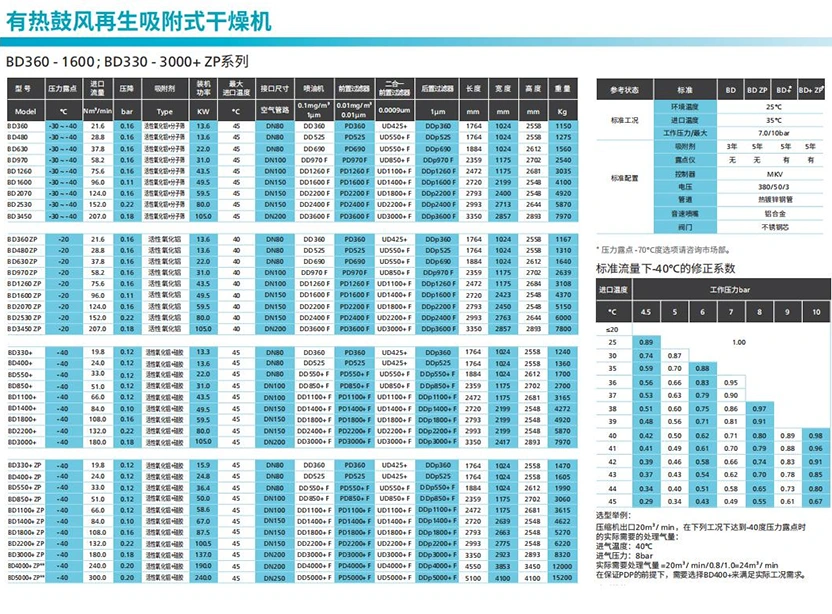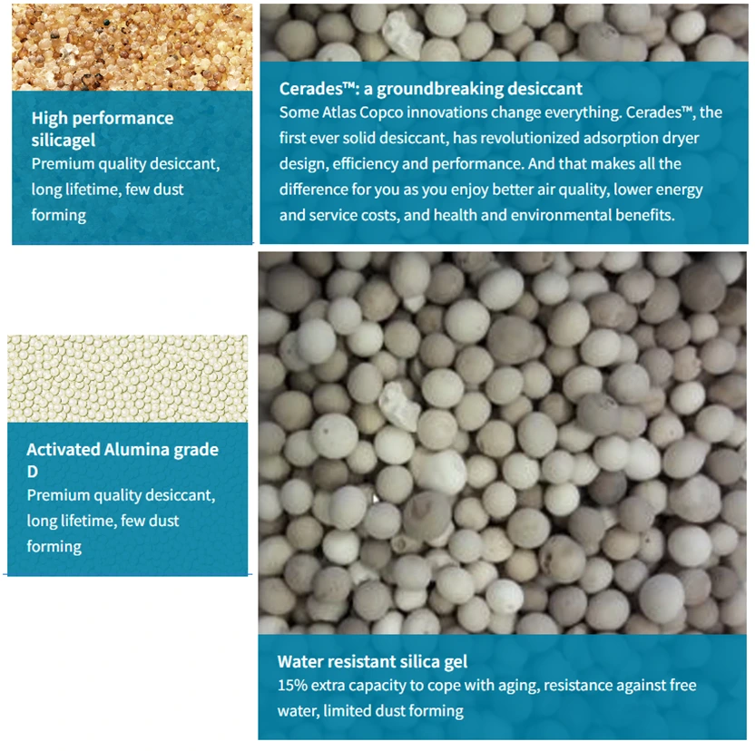 En fonction du point de rosée sous pression, les dessicants peuvent être constitués d'alumine, de gel de silice ou de tamis moléculaires. Le point de rosée sous pression minimum peut atteindre -70 ℃.