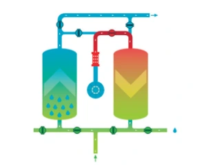Les sécheurs par adsorption à soufflante à consommation d'air nulle sont utilisés lorsque l'application d'air comprimé nécessite un point de rosée sous pression inférieur à 0°. Les sécheurs par adsorption régénératifs se composent de deux récipients sous pression. Les deux récipients sont remplis de dessicant. Un récipient élimine l'humidité de l'air comprimé.