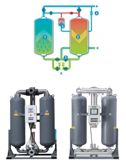 Pendant qu’une tour est en mode adsorption, l’autre est en mode régénération. La régénération des adsorbants consomme la chaleur d'un radiateur électrique et une petite quantité d'air comprimé fini.