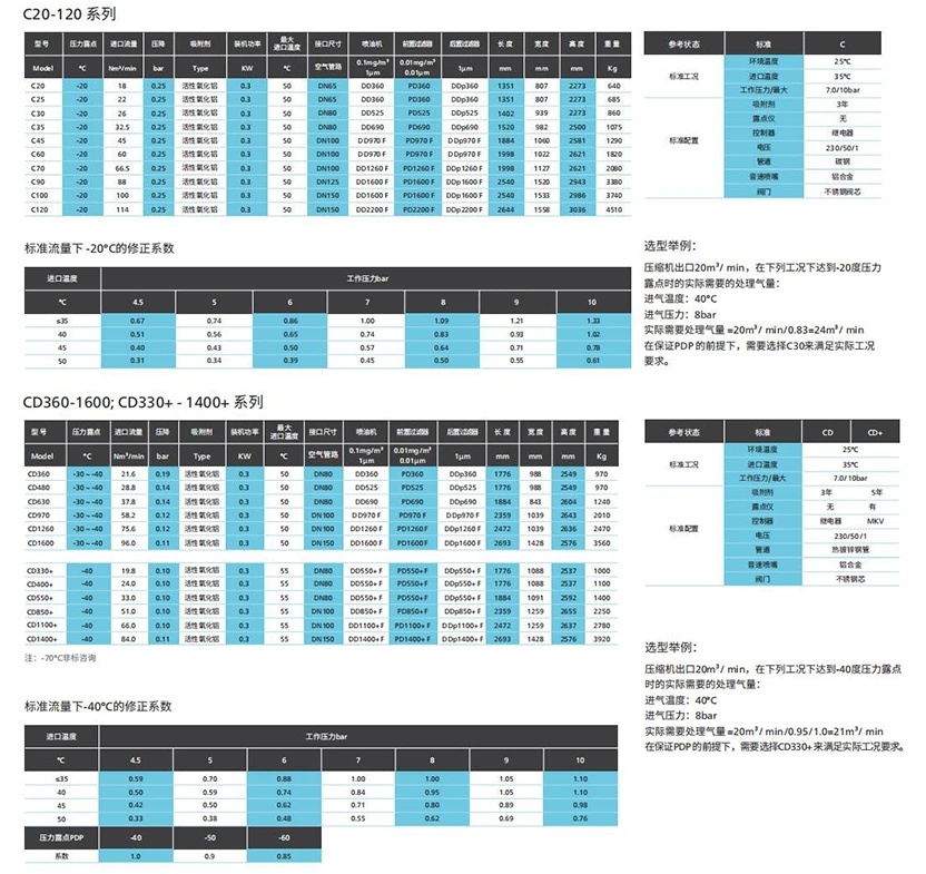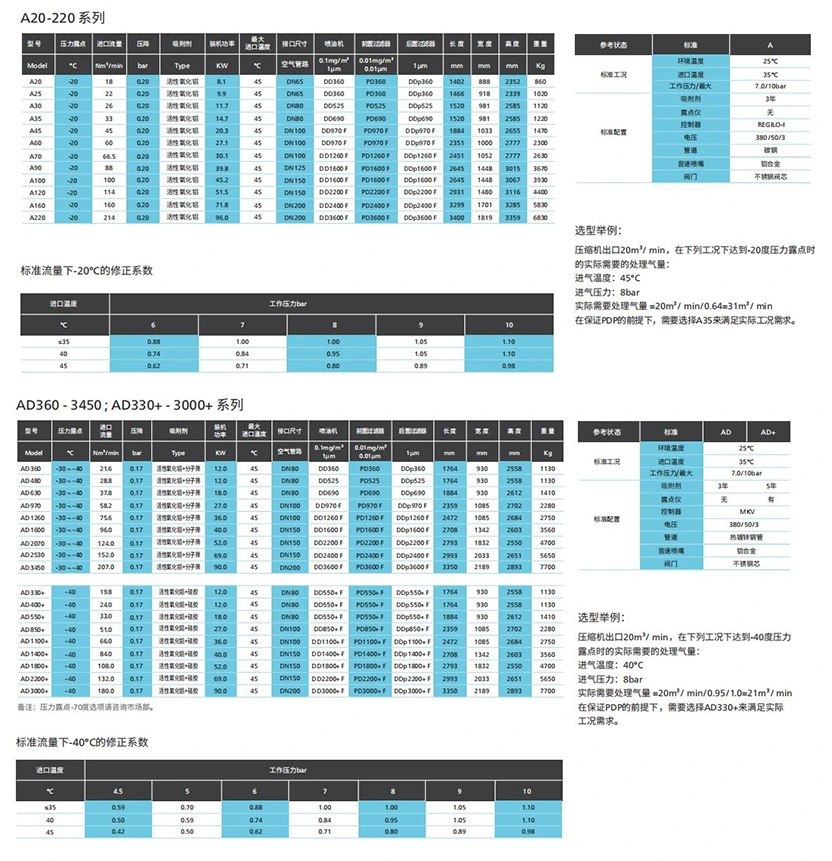 En fonction du point de rosée sous pression, le dessicant peut être de l'alumine, du gel de silice ou des matériaux de tamis moléculaire. Le point de rosée sous pression le plus bas peut atteindre -70°C.